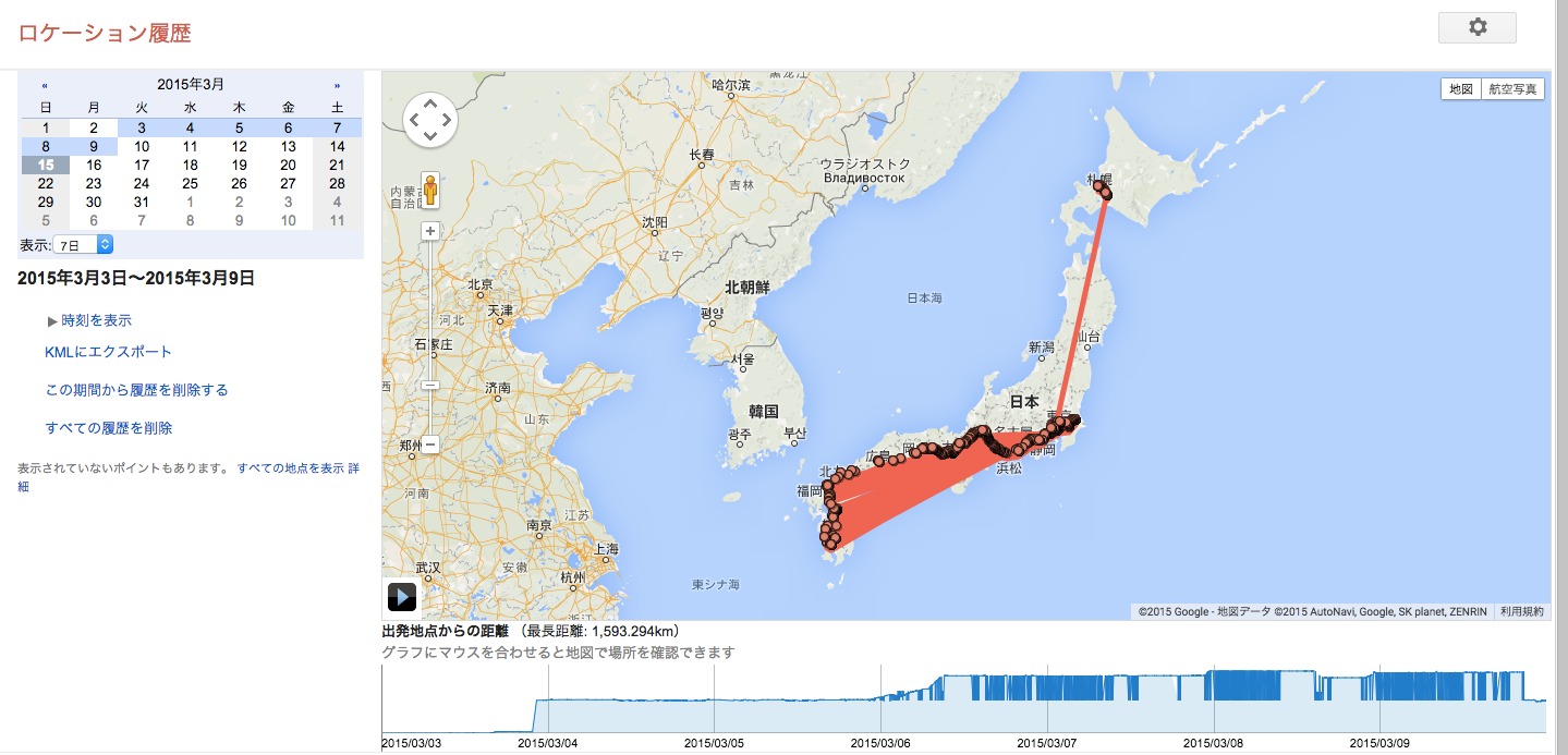 私の3月第1週くらいのGoogleアカウントのロケーション履歴である。